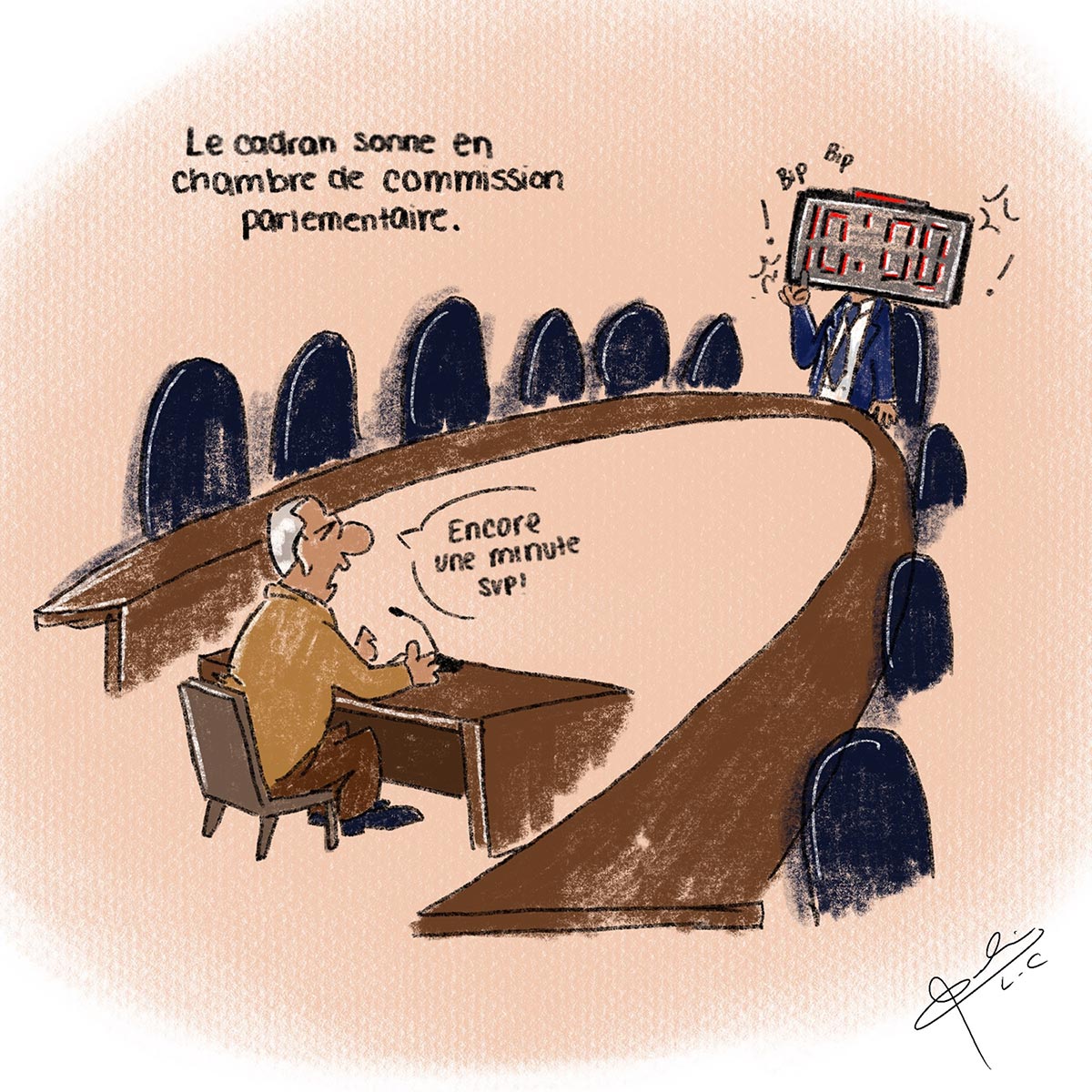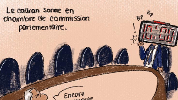 Caricature : Le cadran sonne en chambre de commission parlementaire